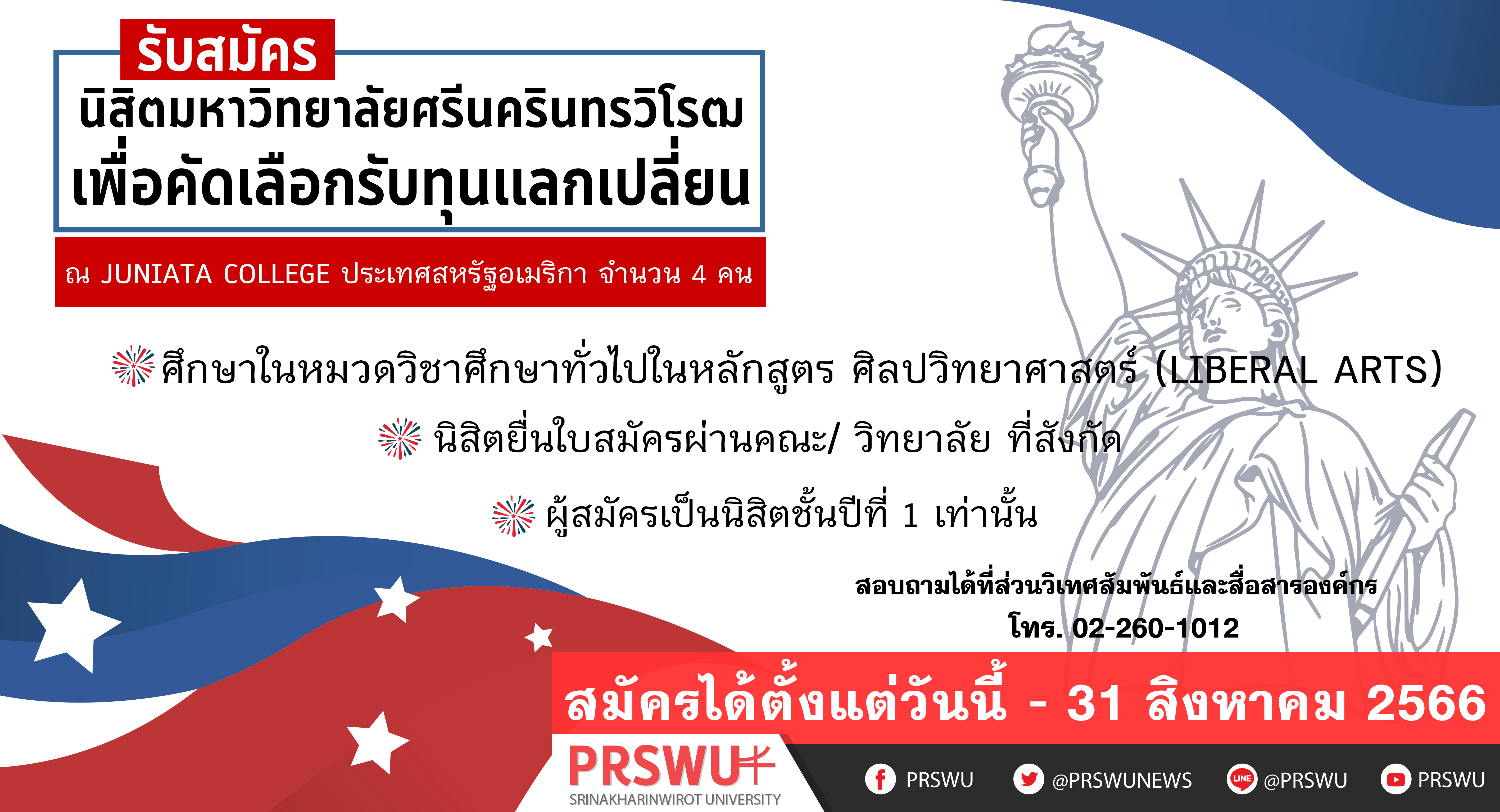 มหาวิทยาลัยศรีนครินทรวิโรฒเปิดรับสมัครนิสิตเพื่อเข้าร่วมการคัดเลือกและรับทุนโครงการนิสิตแลกเปลี่ยน ณ Juniata College ประเทศสหรัฐอเมริกา ประจำปีการศึกษา 2567 ดังรายละเอียดต่อไปนี้