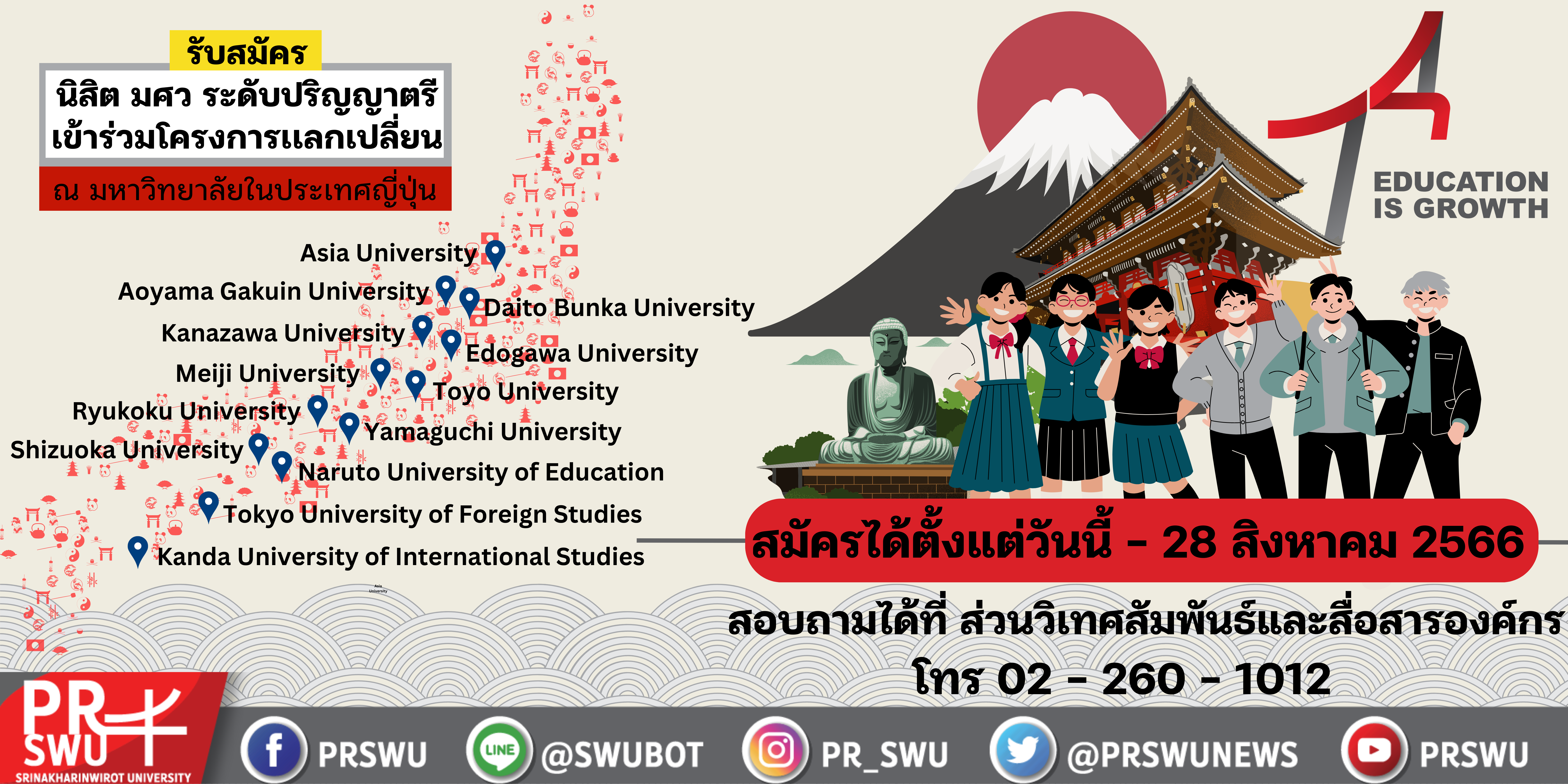 เปิดรับสมัครนิสิตเข้าร่วมโครงการนิสิตแลกเปลี่ยน ณ มหาวิทยาลัยในประเทศญี่ปุ่น ประจำปีการศึกษา 2567